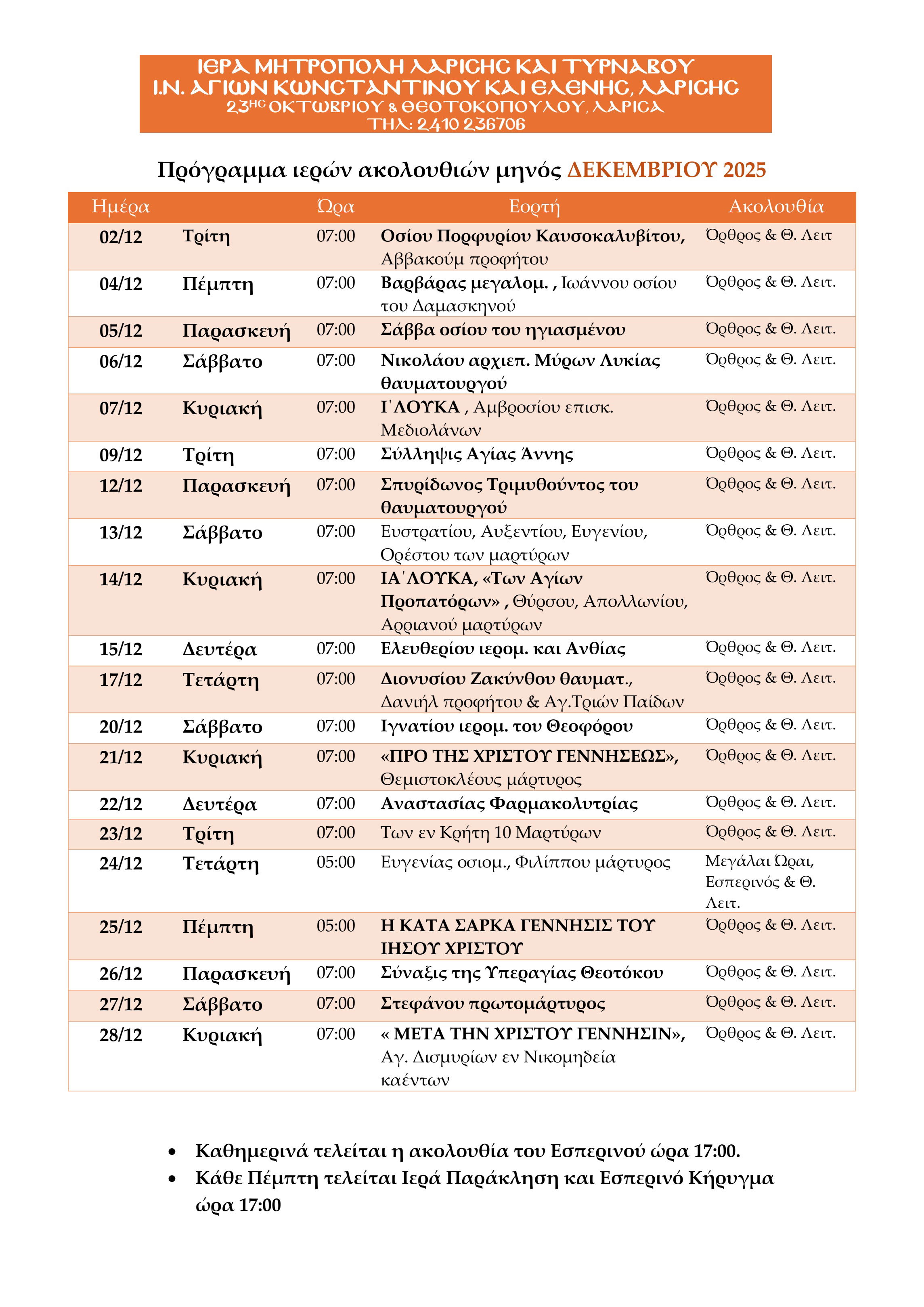 Πρόγραμμα Ακολουθιών Δεκεμβρίου 2025
