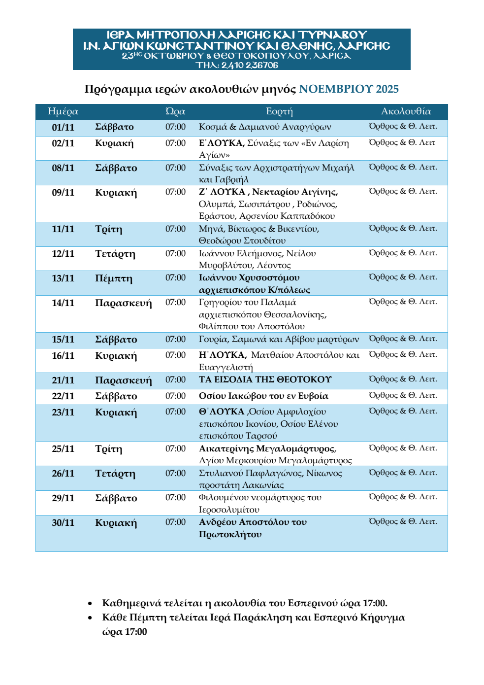 Το Λειτουργικό πρόγραμμα για το μήνα Νοέμβριο
